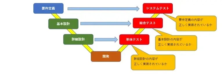 V字モデルを活用すると、開発工程に対応したテスト工程が決められており、実施するテストの内容が明確になることです。つまり、要件定義の内容を確認するのはシステムテスト、基本設計の内容を確認するのは結合テスト、詳細設計の内容を確認するのは単体テストでそれぞれ確認します。