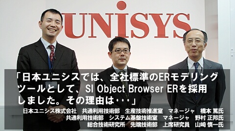 ICTソリューションサービスを提供する日本ユニシス株式会社では、社内標準のERモデリングツールとして「SI Object Browser ER(以下、Object Browser ER)」を採用している。今回は、その導入経緯と採用理由について、実際にObject Browser ERの評価を行った野村氏、橋本氏、山崎氏の3人に話を伺った。