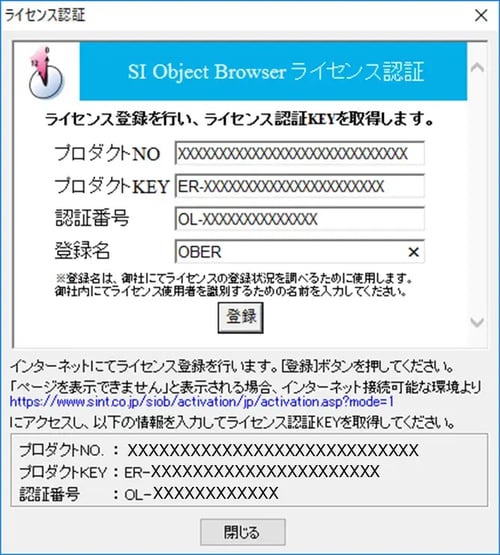 ライセンス登録は、SI Object Browser ERをお使いいただく端末ごとに行います(5ライセンス購入時は5台それぞれで実施)。ライセンス登録はオンラインで行えまが、利用する端末が環境制限などによりインターネットで接続できない場合にも対応しています。