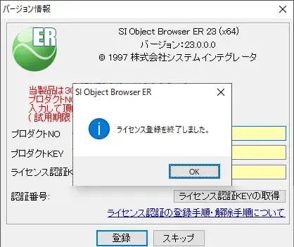 起動時の画面に戻り、上記取得したライセンス認証KEYが自動表示され、[登録]ボタンをクリックします。「ライセンス登録を終了しました。」とメッセージが表示されます。以上で製品登録は完了です。