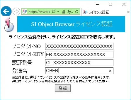 「プロダクトNO」、「プロダクトKEY」、「認証番号」、「登録名」を入力後、[登録]ボタンをクリックします。