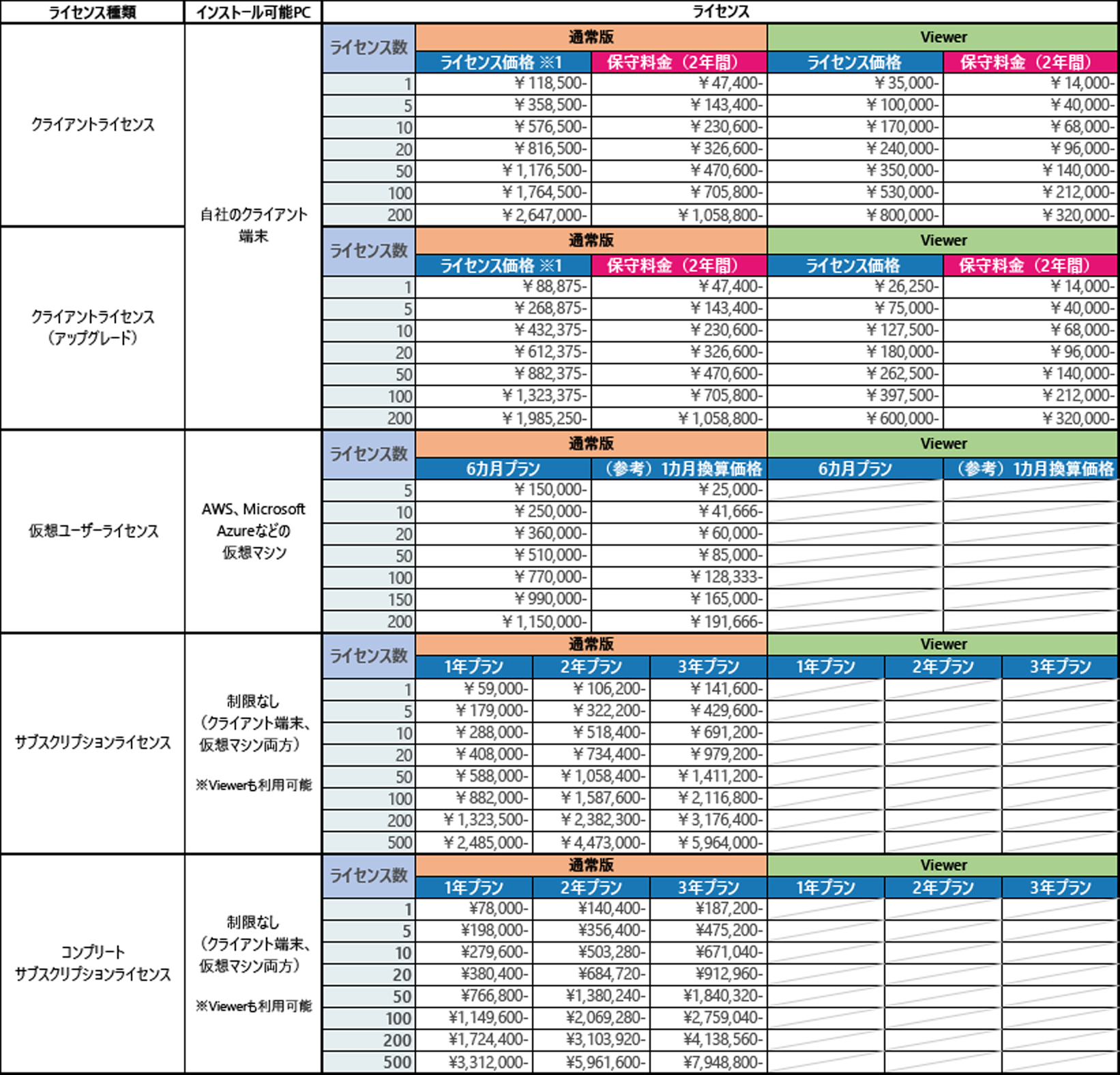 | Viewerの無償提供 | 含まれない(別売) | 含まれない(販売なし) | 含まれる ※ご契約期間に限りライセンス数無制限で利用可能 |