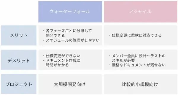 ここまでウォーターフォールとアジャイルそれぞれの開発手順、メリット・デメリット、最適な開発業務、不向きな開発業務の違いについて説明しました。