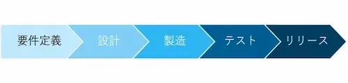 要件定義で、開発を始める前にユーザーの要求を実現するために実装する機能や性能などを定めて具体的にどのように進めるかを決定し、設計、製造、テストと工程を進めていきます。すべての工程が完了すると、ようやくシステムがリリースできる仕組みです。大きな特徴として前工程が完了しないと次の工程に進めないことがあります。