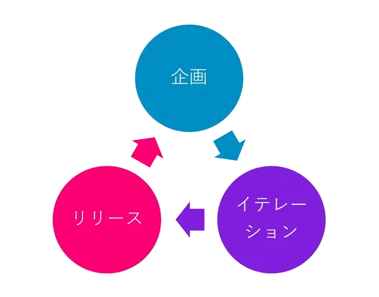 アジャイル開発では、チームを組み、要件定義・設計・開発・テスト・リリースといった開発工程を一つひとつの小さな機能単位で繰り返し行い、文字通り素早く(Agile:アジャイル)、ユーザーを巻き込みつつ、機能をブラッシュアップしながらプロダクトを完成させていくという手順を踏みます。全機能を横断的に進めるウォーターフォール開発と異なり、軽量な開発手法となっています。