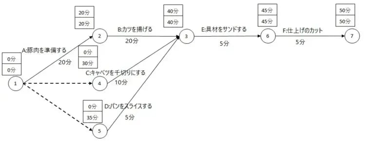 (結合点1-4、1-5間の矢印は、実際には存在しない作業時間0分のダミーの作業のため、点線で図示します。)