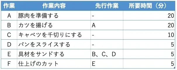 アローダイアグラムの作成のために、まずは必要とされる作業工程の洗い出しと整理が必要です。サンプルのアローダイアグラムの作成では、カツサンドの作成に必要な手順の整理のために、以下のような表を作成しました。