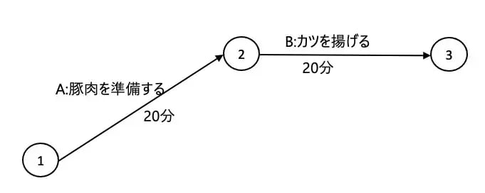 - 「A:豚肉の準備」作業が完了してからでないと、「B:カツを揚げる」作業に着手できない。