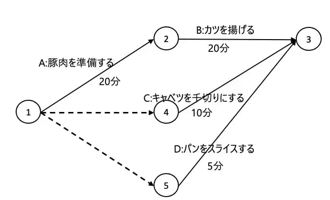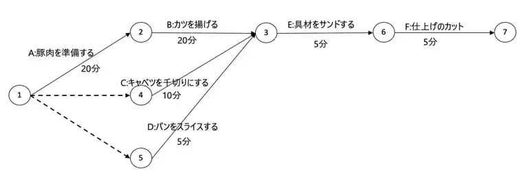 先程のカツサンド作りのアローダイアグラムを例に、アローダイアグラムの書き方を解説します。サンプルのアローダイアグラムは、以下の手順で作成されました。