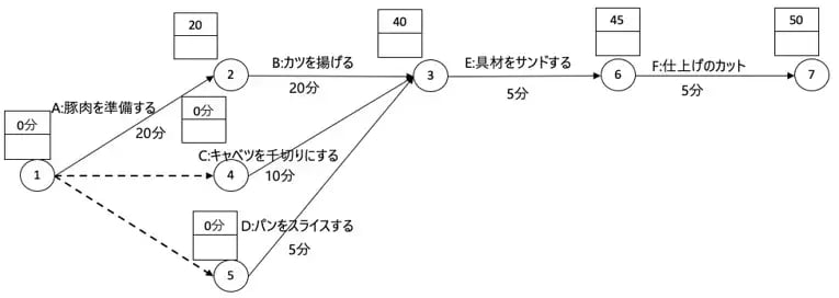 上記のサンプルは、カツサンドを作成する場合の作業の流れを図表化したアロー ダイアグラムです。