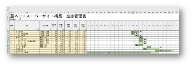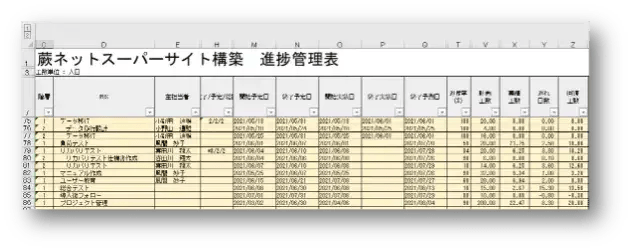 表上のセルに書式や数式の設定ができるので、工数の計算や、遅れ等を管理しやすくなっています。