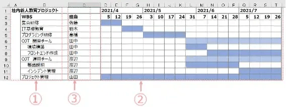 新人研修も進捗管理表にすることで、誰がいつどのような教育を行うかを把握することができます。マスタースケジュールと言って開始から終了までの全体スケジュールを作成しました。実際にプロジェクトとして進捗管理する場合、担当(講師)ごとにBreakDownしたタスク(WBS)を追加していきたいものです。