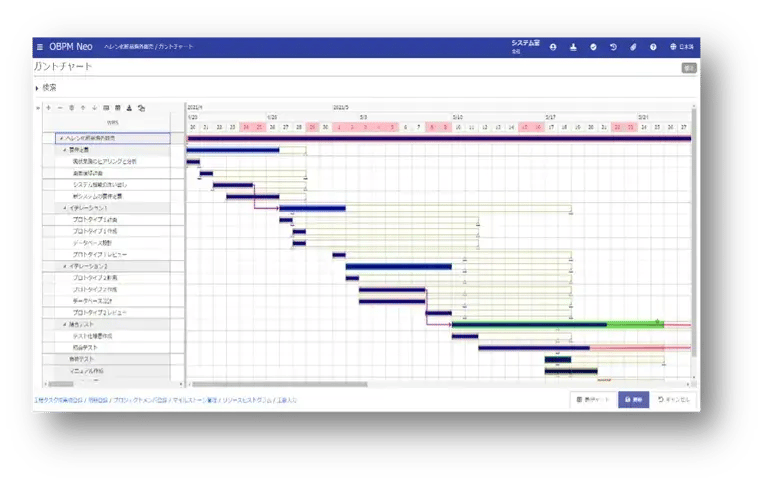 「OBPM Neo」はプロジェクトの立上~終結まで1つのサービスで運用することができます。もちろんガントチャートで日々のスケジュールを管理するとともに、進捗報告機能で