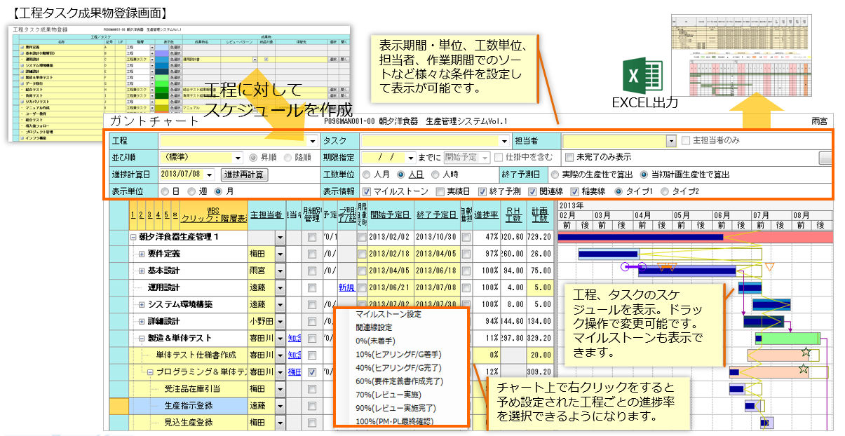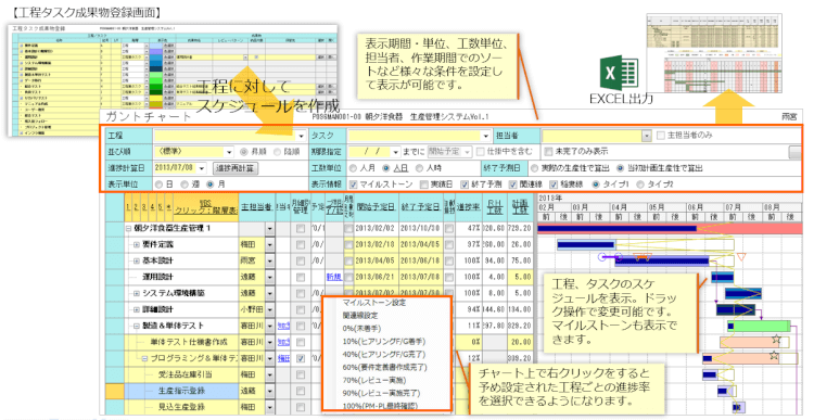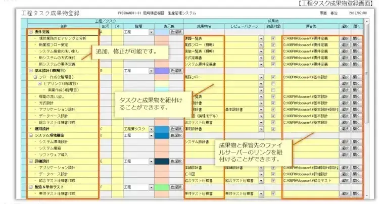 システムで作成できるので、計画にかかる手間や時間を短縮して作業負荷を軽減できますし、工程、タスクなどの抜け漏れの防止になります。