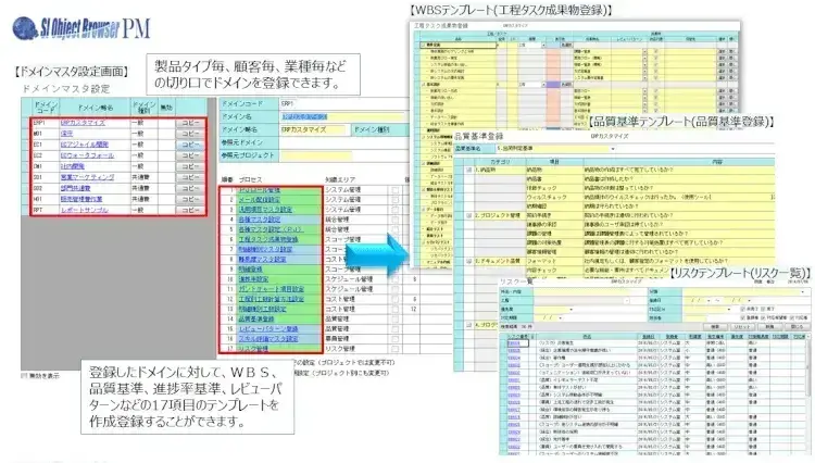 Aさんの工程管理は細かいけどBさんは工程管理が荒く抜け漏れが多い。ベテランと新人でノウハウの共有がうまくできない、勘や経験で工程管理をしているなどの課題を多く聞きます。 OBPMでは、そのような悩みを解消する「ドメイン(テンプレート)機能」があります。開発手法、製品、顧客などにより管理する工程や成果物、工程でチェックするレビュー項目などはある程度パターン化されていると思います。OBPMでは、WBSや進捗率の定義、品質チェック項目、リスク項目など17項目をテンプレート化することができます。