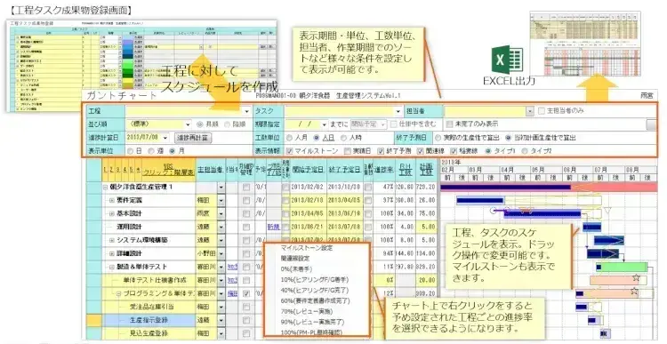 そのためにもExcelではなく、システムを導入して管理することをおススメします。もちろんコストはかかりますが、利用していけば管理する時間が短縮でき、状況もすぐに把握できるので素早い対応も可能になります。また、ノウハウもどんどん蓄積されるので、分析してよりよい工程管理に改善していくこともできます。