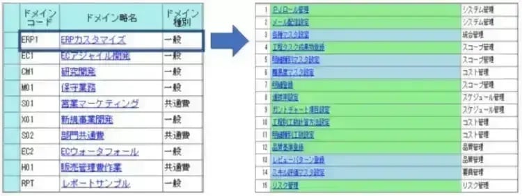 業務タイプごとにドメインが登録されているため、ある業務のやり方を変更した時は、該当するドメインのプロセスを変更すればよいわけです。他のドメインに影響を与えないため、Excelテンプレートで発生する標準崩れを防ぐことが可能になります。