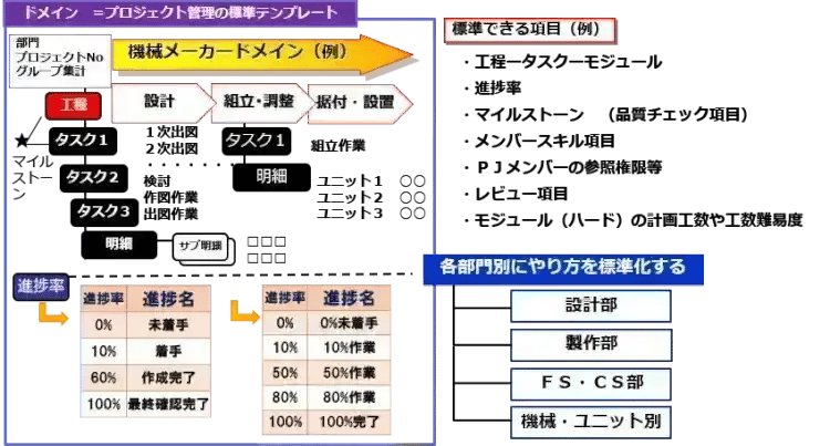 OBPM IT向けで好評であったドメイン機能で、機械メーカーの工程―タスクなどを標準化することができます。たとえば、下記イメージ図をご覧ください。