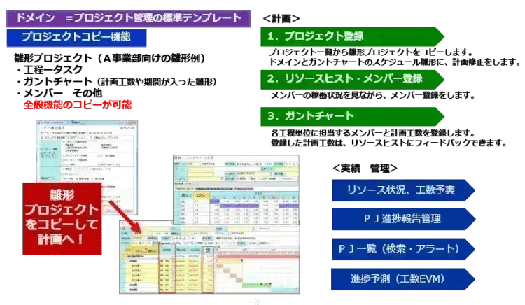 ドメインで標準化された工程―タスクを定義し、雛形プロジェクトコピー機能により、簡単で効率化された計画を立てられます。利用シーン別に順番にご説明しますと、まずは製番別にプロジェクト登録し(製番連携可能)、メンバーの負荷状況の見ながらメンバー登録、リソース計画を行い、ガントチャートでスケジュールを立案していきます。