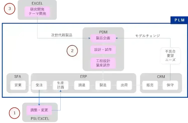 定期的にモデルチェンジが行われる完成品においては次期製品の試作開発が行われています。モデルチェンジのタイミングは製品によって様々ですが、短いものでは1年、長いものでは5年といったサイクルで行われています。(製造業におけるITシステム ②)