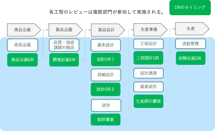 本作までの試作開発では、現行製品の不具合や顧客からの要望、営業担当者から共有される新規ニーズを取り入れて開発が進められます。試作開発は、製品企画からスタートし、設計、試作・試験、工程設計、量産試作という流れで進みますが、各工程の最終段階ではデザインレビューが行われます。