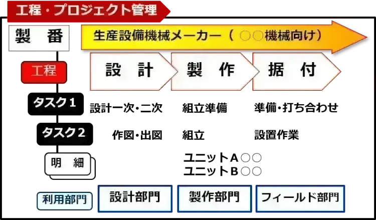 この工程・プロジェクト管理の考え方は、製造業のみなさまによく言われる表現で「製品や製番(機械)の進捗を‘人’中心で見ていくやり方ですね」と言われます。つまり材料費等のコストだけを見ていくのではなく、人間がやる作業を工程・タスクに標準化し、計画と実績を見ていくマネジメント方法であるという意味です。このような製造業に‘人’中心で見ていく考え方を取り入れてみてはどうでしょうか?