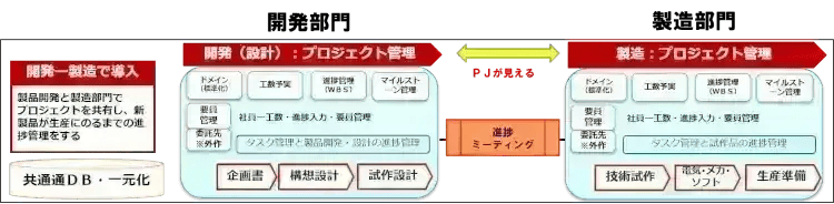 開発部門は新製品を作るために、企画→構想→試作設計を繰り返していきます。そして品質部門とは設計レビューや試作レビューを何度も行うマイルストーンという作業があります。その後、量産に移っていく場合は生産準備作業や量産レビューを行います。このようにして新製品が出来上がっていきますが、これらの工程の進捗管理や品質管理(マイルストーン)をしっかりと組織で行い、計画通りに新製品の進捗が進んでいるかどうかを、品質も合わせて見ていくことができます。