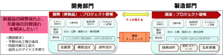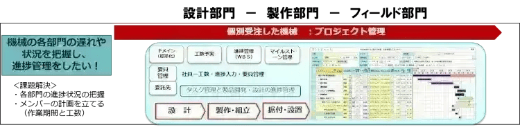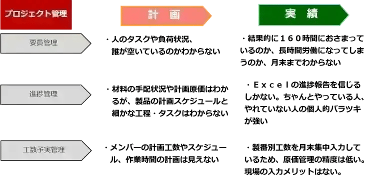 ・生産管理システムは導入されているので、モノやお金の管理や、原価管理はできている。しかし課題は製品ができていくまでのスケジュール・進捗管理や人の管理ができていない。
