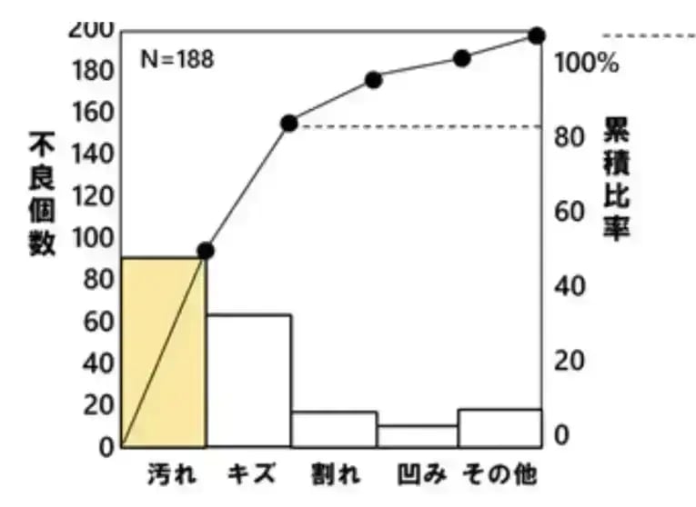 右軸:累積比率、左軸:不良品数、横軸:不良品の原因別