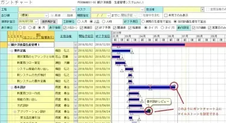 各プロジェクトのガントチャート上に、フェーズゲートとなるマイルストーンを設定できます。