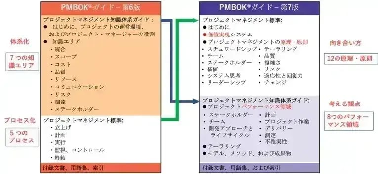 ただし、単に位置をテレコにしただけでなく、第6版の「10の知識エリア」が第7版では「8のパフォーマンス領域」に変わり、第6版の「5つのプロセス」が第7版では「12の原理・原則」に置き換わっています。