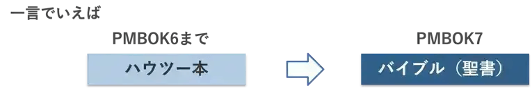 この表面だけ見て、知識エリアがパフォーマンス領域に、プロセスが原理・原則に変わったとするのは早計です。変に2つのタイトルを前後だけ変えて流用したから誤解されるのであって、そもそも書籍に含むコンテンツの性質ががらりと変わっているのです。これを一言でいえば、第6版までは「ハウツー本」だったのが、第7版では「バイブル(聖書)」です。PMBOK7を理解するには、この性質の違いを頭に入れておく必要があります。