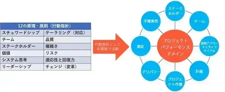 そこで新たに打ち出された概念がパフォーマンスドメイン(活動領域)です。12の行動指針を意識しながら、チームの観点、ステークホルダーの観点というような8つの活動領域を定め、それぞれの観点でどのようなことを考慮しなければならないかを定義しているのです。