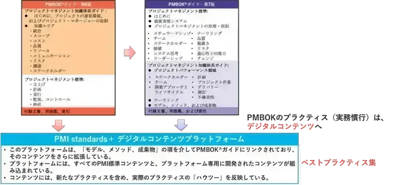 PMBOK6まで長年にわたって培ったハウツー(Body of Knowledge)はどうなったのでしょうか。実は、これらのナレッジはデジタルコンテンツとして利用する方式に変わりました。