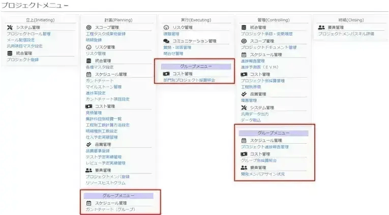 OBPM Neoは、複数のプロジェクトを統合管理するプログラムマネジメントにも対応しています。例えばグループガントチャートを使うと、複数プロジェクトのガントチャートをまとめて管理することができます。また、複数プロジェクトをまとめて採算管理したり、要員を管理することもできます。