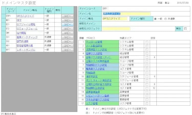工程を細分化して管理すると言っても、そこはベテランと新人の差がどうしても出てしまいます。そうした場合は、ノウハウを伝えていくことも大切ですが、開発手法や製品などそれぞれ標準的な工程管理のテンプレートを用意しておくことが重要です。テンプレートを用意すればそれに従ってやればいいということになりますが、Excelなどのテンプレートではどうしても標準が標準でなくなってしまったり、いつの間にか利用されなくなってしまったりすることなどが往々にしてあります。例えば、当社のプロジェクト管理ツール「SI Object Browser PM(OBPM)」では、ドメインという17項目のテンプレート機能を利用してプロジェクトを開始することができます。工程計画のテンプレートや進捗率のマスター化、品質チェック項目などのテンプレートを利用することで抜け漏れを防ぐことができるので、誰でも一定基準でプロジェクトをスタートすることができます。