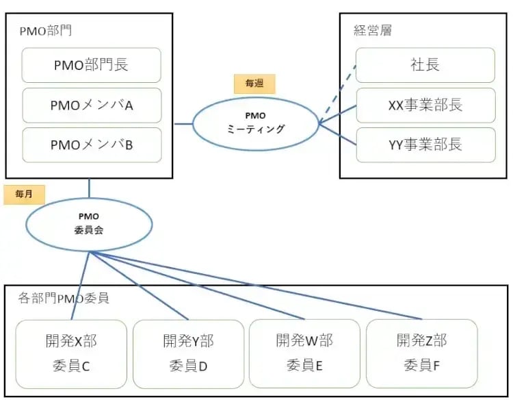 - PMO部門は、プロジェクトマネジメントの方針・ルールを決定・通達し、各部門の問題・課題を吸い上げるためのPMO委員会を開催する