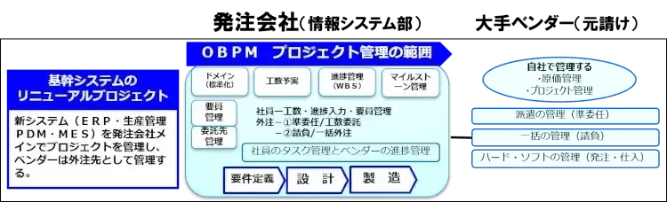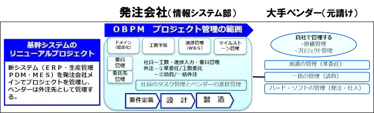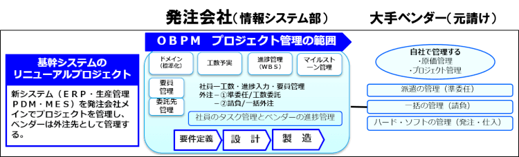2)大手ベンダー(一括請負) ・・ 業務システム別(例:生産管理:PDM)に、要件定義は準委任で依頼し、基本設計→詳細設計→製造・単体テスト→結合テストまで一括請負で進めていく(以下、製造フェーズ)。要件定義の作業タスクには、情報システム部の社員も参画し、業務改善チームの社員も加わるため、大手ベンダーと協力して、WBSを引いていくことになる。基本設計以降の製造フェーズは大手ベンダーにコスト管理と進捗管理を任せ、情報システム部側では大手ベンダーの進捗状況をチェックしていくために、進捗ミーティングを定期的に行う。ハードやソフトの仕入管理も大手ベンダーに任せるが進捗状況は把握する。