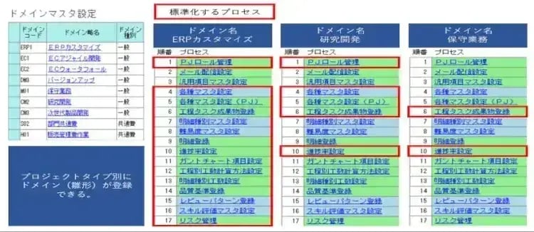 各ドメインでは、最大17個のプロセスが登録できます。工程タスク(WBS)を中心に、工程別進捗率、工程別レビューパターン、工程別品質基準、見積方法などPMBOKに準拠したプロセスを標準化します。説明が終わると、推進メンバーの間で活発な議論が始まりました。