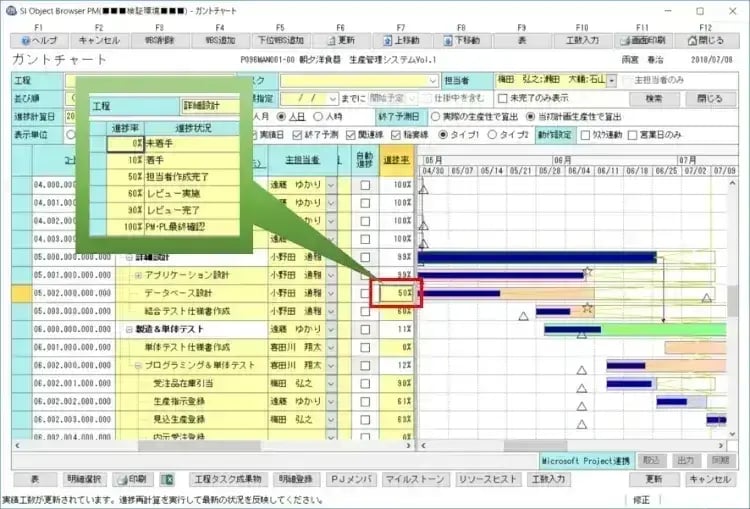 各メンバーは、上記の【ガントチャート】画面より進捗率を入力しますが、その際に既に用意されているマスタから進捗率を選ぶことが可能です。
