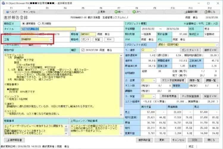 もし、工程毎に責任者が分かれているのであれば、各工程の責任者は自分の工程を選択し、画面右側に表示される定量的数値と、現在の状況を分析し、画面左側に定性的な報告を記載する。そういったご利用イメージが、工程別の進捗報告になります。