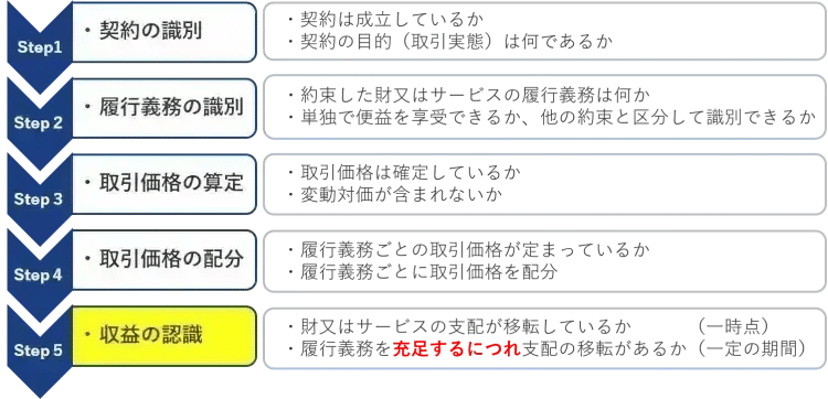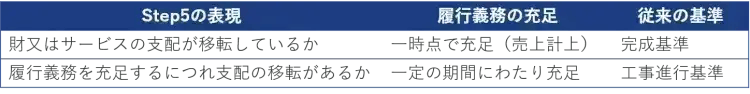収益認識基準ではStep1~4でどのような履行義務をそれぞれいくらで取引するか契約していることが前提で、Step5で履行義務を充足したときに売上計上できると定義しています。ここで「履行義務の充足」とは、“財又はサービスの支配が移転”という意味で、「履行義務を充足するにつれ」という言い回しもあるため、従来の工事進行基準的な収益認識も認めている。と考えられます。