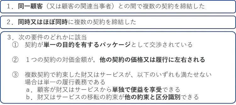 形式的には複数の契約ではあるが、実質的には1つとみなされた場合に全体を“単一の履行義務”と見なして収益認識基準を適用することです。契約の結合がなされた場合、それらは1つの契約と見なされるので個別に売上計上できなくなります。