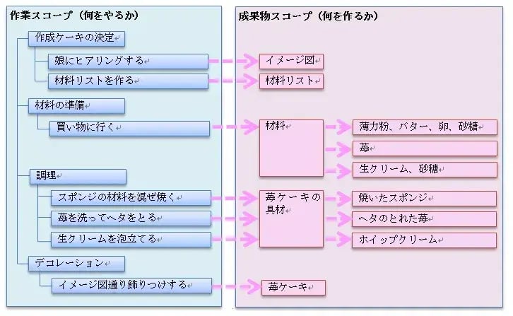 スコープの定義では、「何をやるか」「何を作るか」という範囲を明確にします。図1は誕生日ケーキを作るために「やるべきこと」と「つくられるもの」を分けたものです。このように作業スコープおよび成果物スコープは、それぞれ階層構造になります。前章で説明したWBS(Work Breakdown Structure)は、作業を分解してスコープを洗い出す図法でしたね。つまり、WBSで分解するのは成果物スコープではなく作業スコープです。