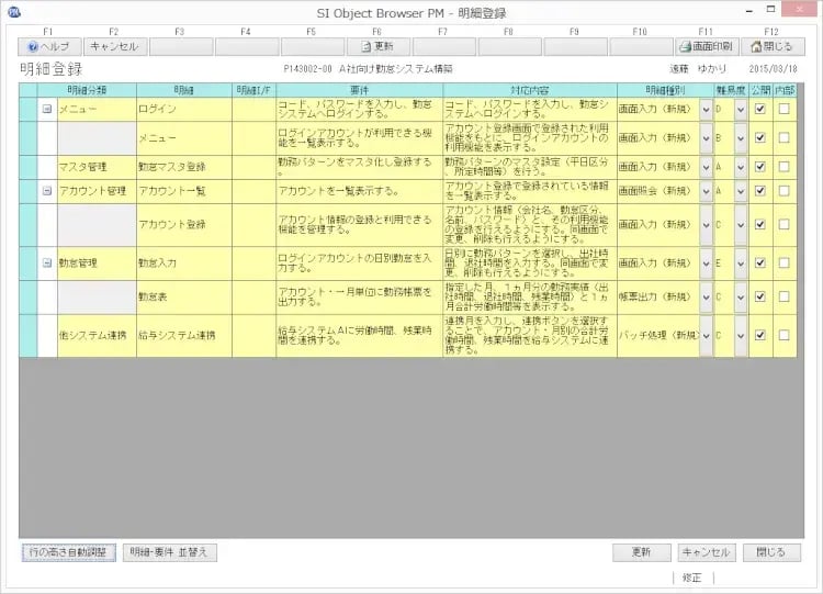 当社ではこの成果物スコープについてもOBPMで管理しています。「画面2:成果物スコープ(明細登録)」のような画面で機能の一覧とその要件、対応内容、種別、難易度を決めておき、見積やWBSへの連携を容易に行えるようにしています。