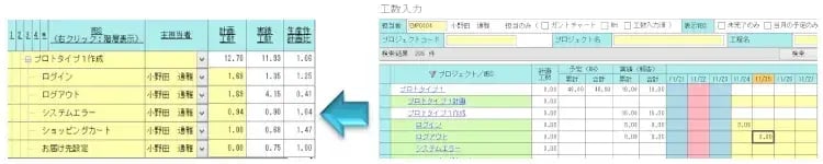 画面2:日々の工数入力値をガントチャートの実績工数へ連携