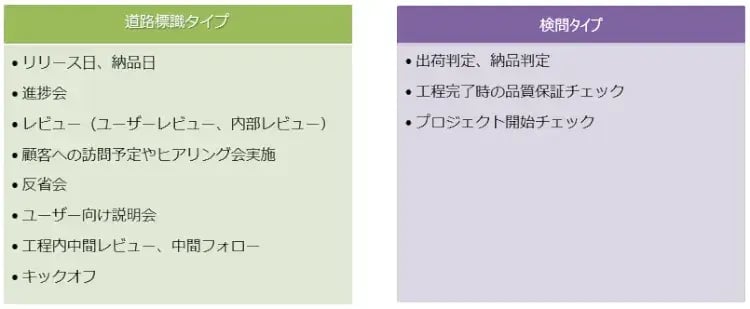 1つは「リリース日」や「進捗会」、「レビュー」のように期日を明確にして決められた日程の管理を行う「道路標識タイプ」。こちらは”目標”としてのマイルストーンです。