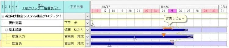「設計レビュー」で考えてみましょう。基本設計工程の期間が10/1~10/31だとします。設計レビューを10/24~10/25に実施する場合、図2のようにガントチャート上にマイルストーンを設定します。