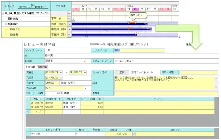 マイルストーンを実施した場合、チャート上のマイルストーンも完了にします。この際、マイルストーンの色や形を変更すれば一目で未完了かどうかわかります。OBPMではレビューを行った場合に、色や形を変えるのに加えて、下の図のようにレビュー実施登録画面により結果をマイルストーンと関連付けすることもできますので、レビュー内容も共有できます。