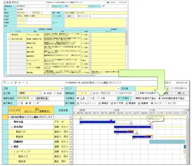・プロジェクトメンバーは、設計レビューの日程をガントチャート上で確認でき、リミットを意識できます。この日までには間に合わせてくださいね。と締め切りを明確にしましょう。